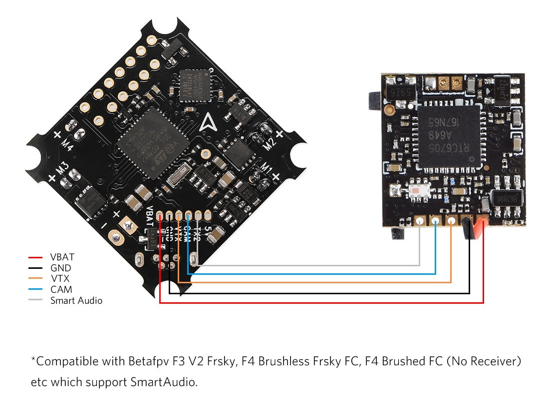 - Smart Audio Function: The flight controller can communicate with the video transmitter using the audio line in. It allows the flight controller to know what frequency the vtx is using, and to change it.