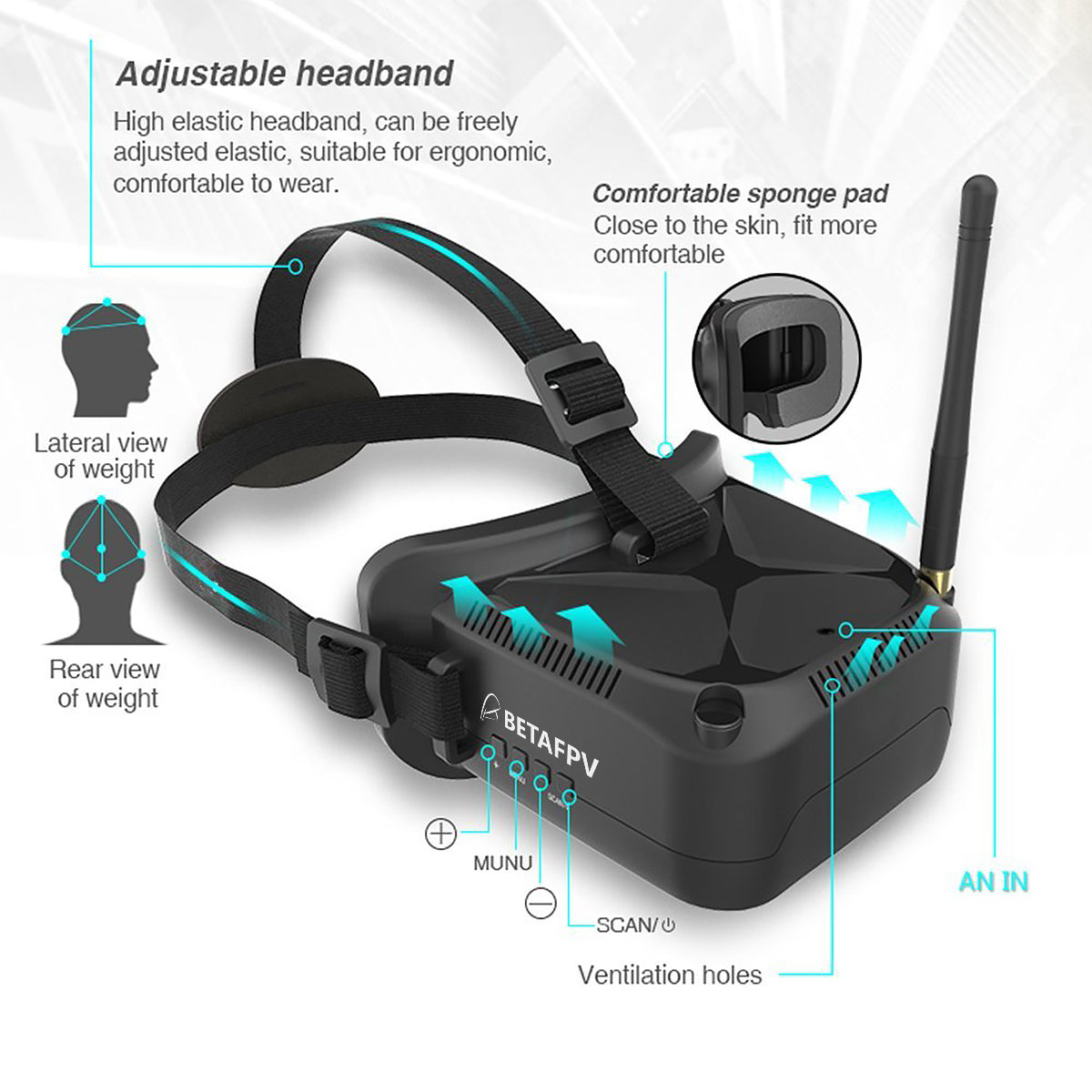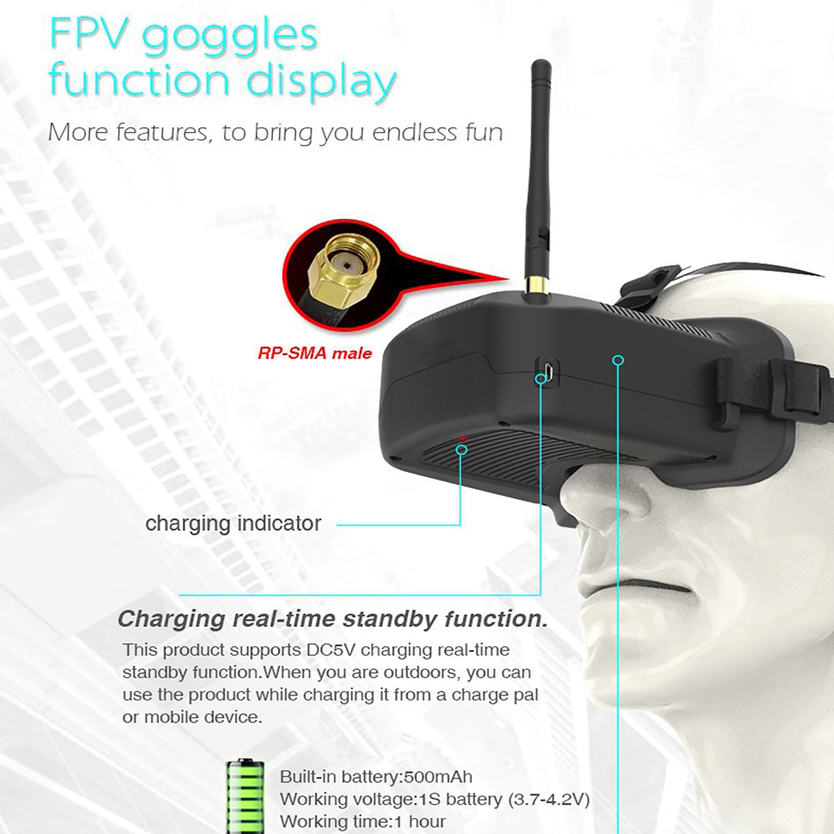 This tiny 5.8g video goggles VR006 is just designed for beginners. Just easy to set up, one-button auto search channel. With built-in batteries, it charges via a USB cable and works for 1 hour when full charged.