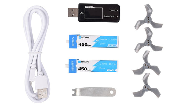Comes with spare parts including 2 pcs BT2.0 450mAh battery, 1pc BT2.0 battery charger&tester, super portable for charging. What’s more, the Batteries, USB charger, and Spare parts for easy repairs. We also provided 4 props and 1 prop removal tool, convenient to exchange the props.