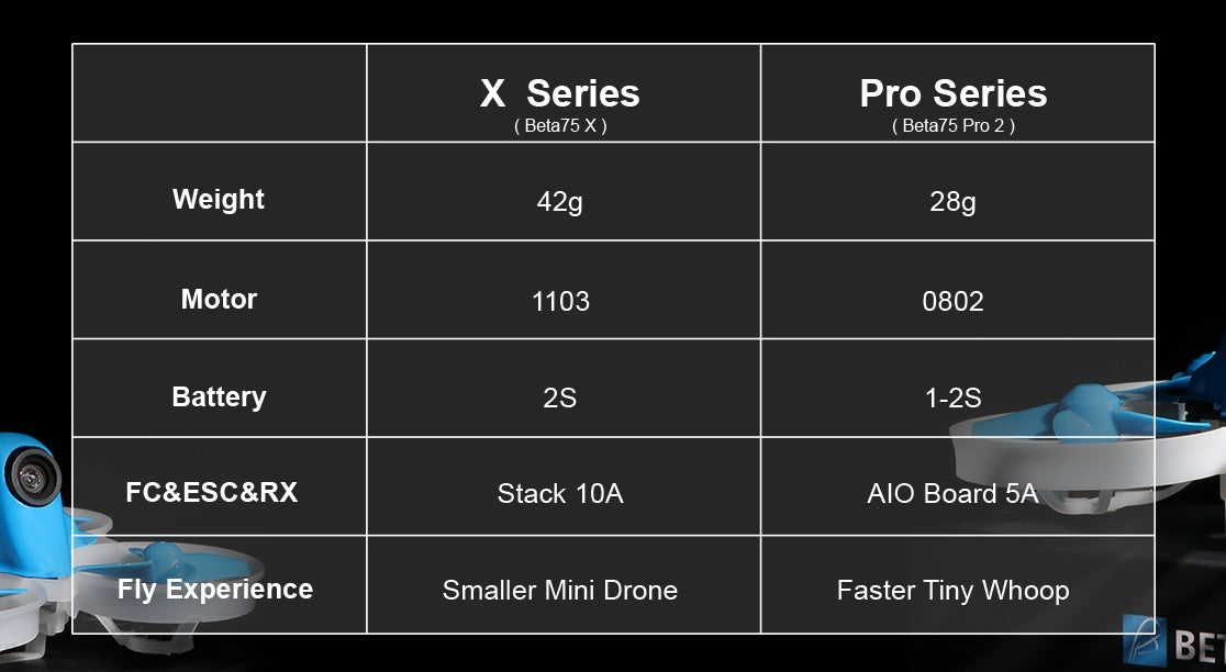 Here is a specification comparison of the 75mm brushless drones, Beta75X and Beta75 Pro 2.