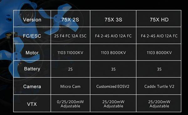 For 75mm brushless whoop drones, there are 3 versions for your choice – Beta75X 2SBeta75X 3SBeta75X HD.