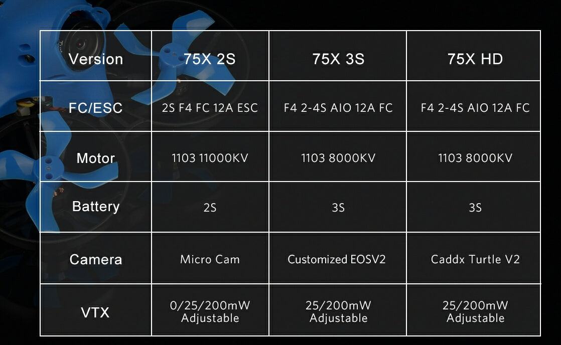 For 75mm brushless whoop drones, there are 3 versions for your choice – Beta75X 2S, Beta75X 3S, Beta75X HD.