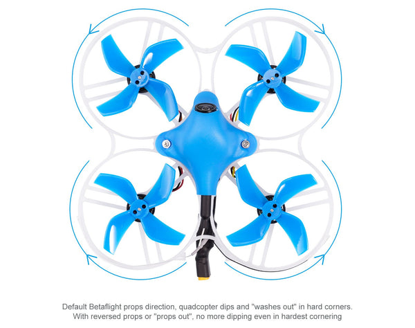 Default Betaflight props direction, quadcopter dips, and “washes out” in hard corners. With reversed props or “props out”, no more dipping even in hardest cornering.