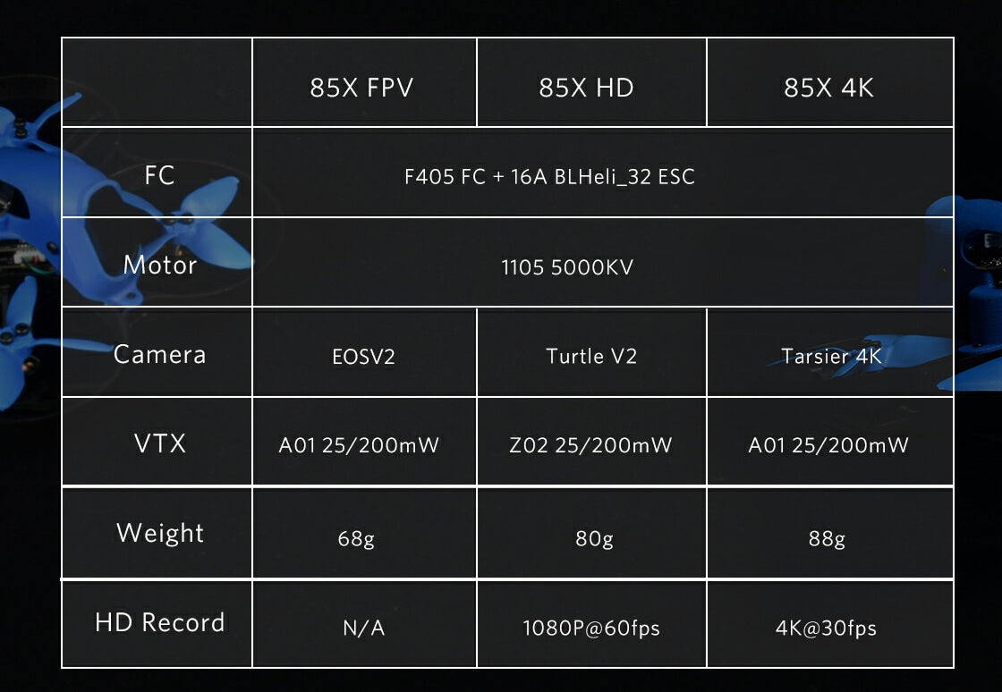 For 85mm brushless whoop drones, there are 4 versions for your choice – Beta85X FPVBeta85X HD, Beta85X 4K and Beta85X for GoPro.