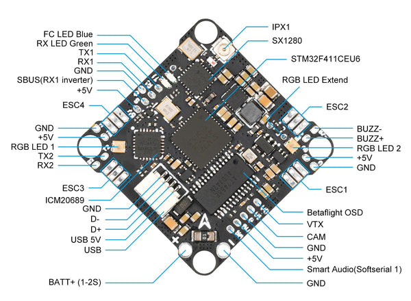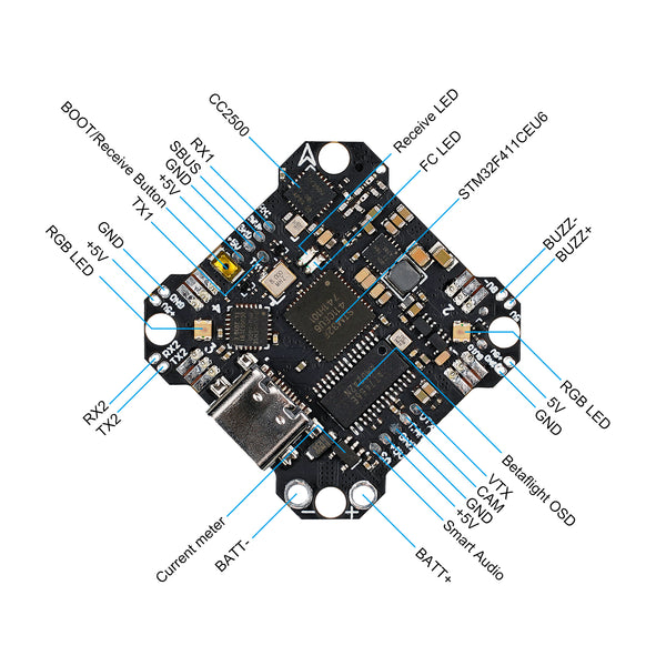 - Built-in current meter, 2 programmable RGB LEDs, and SPI Frsky receiver. At the same time, all the pads are left for the external receivers with UART1 and UART2, for buzzers, etc.