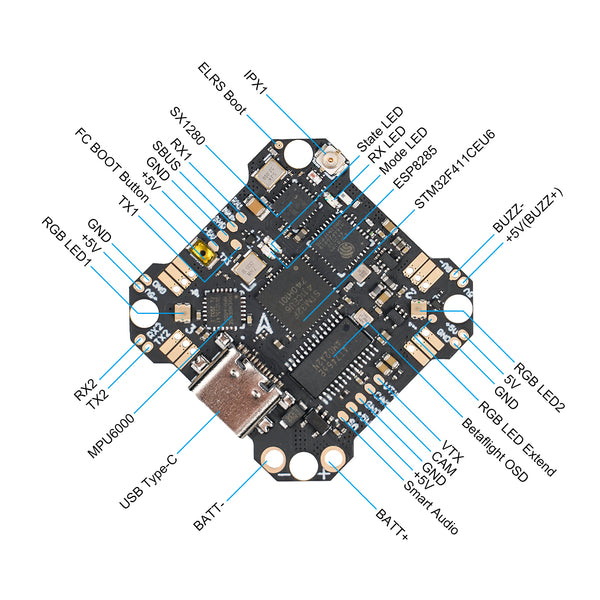 Since Betaflight has not yet released the official firmware that could supports the SPI ExpressLRS protocol, the current version is the Beta version. Please use the firmware and the CLI dump file below to recovery the FC board if needed. Betaflight will update to their official target soon. Please feel free to contact with us if you have any issues with this Beta version Firmware.