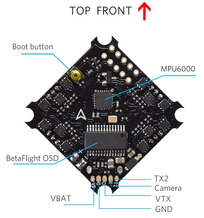 - OSD: Built-in BetaFlight OSD (STM32 controls OSD chip over SPI in DMA mode)