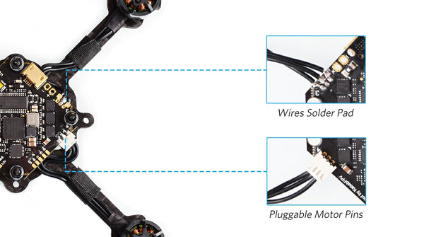 - Double-sided motor solder pad. Pins pad and wires pad are both built-in for motors connection