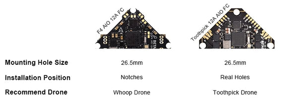 Both borads are designed in the same size for micro whoop drone, we refine the toothpick 12A AIO FC with a real holes based the feedback of some of our customer and for better mount on the toothpick drone.