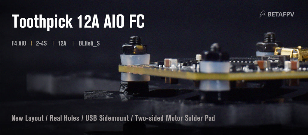 The new layout 12A 2-4S F4 AIO FC(BLHeli_S) is customized for Toothpick Drone. With the real holes, side-mount USB and all solder pads of the edge of FC, greatly reducing installation time and improving ease of self-assembly. The weight saving of the all in one board makes this ideal for tight builds – using the included Anti-vibration rubber dampers for mini stack height.