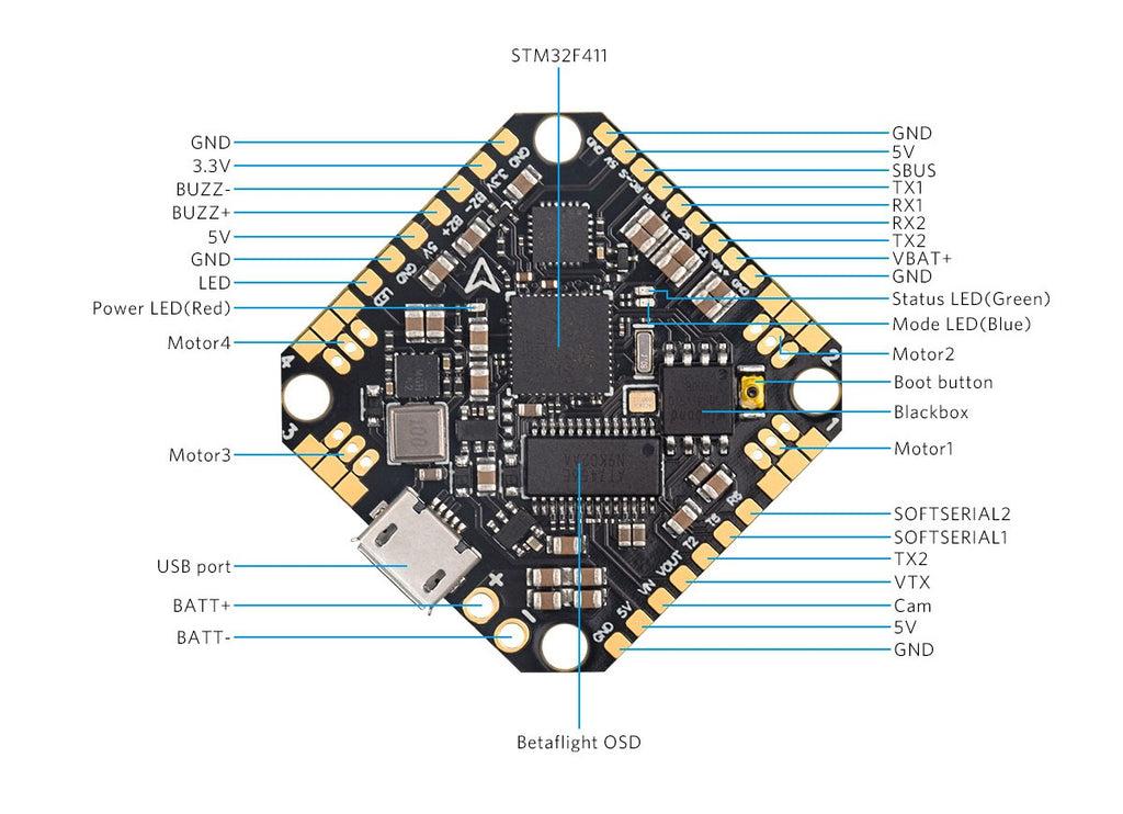 - Support BLheli/BLHELI_S suite Pass-through ready
