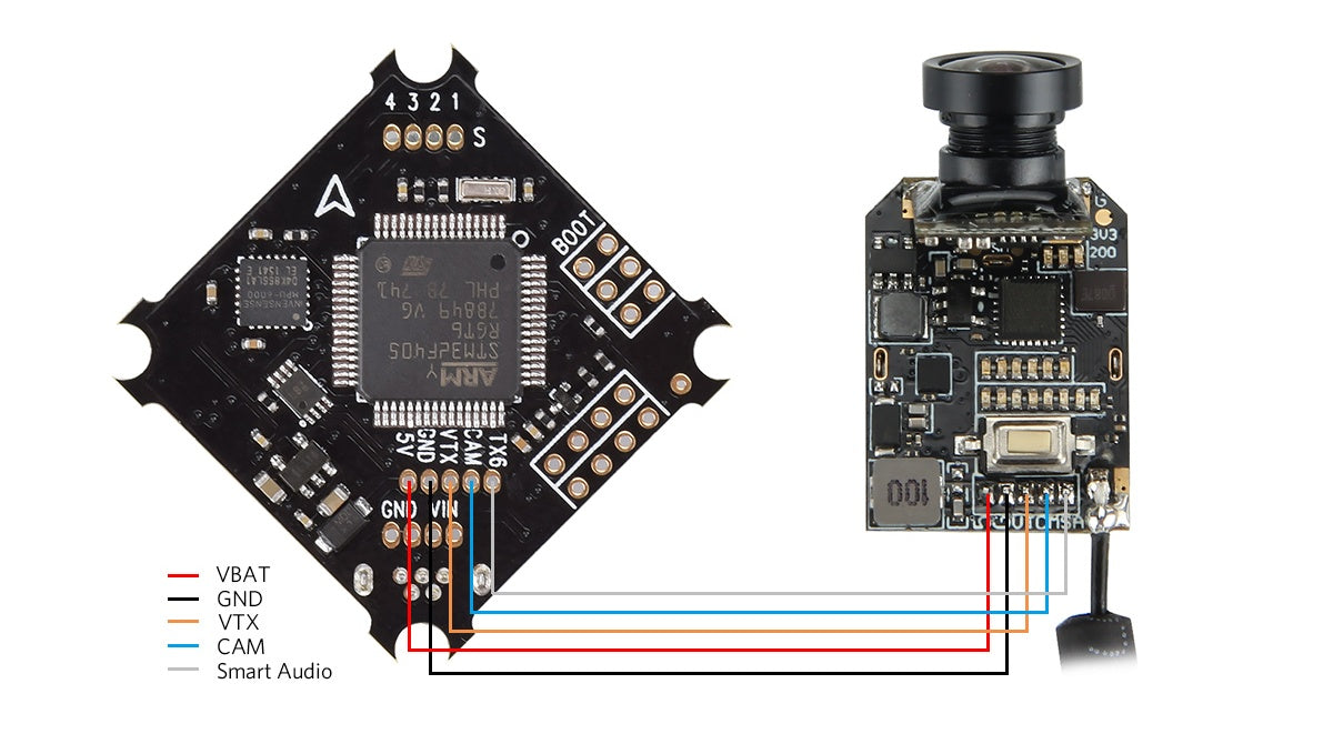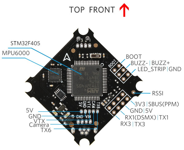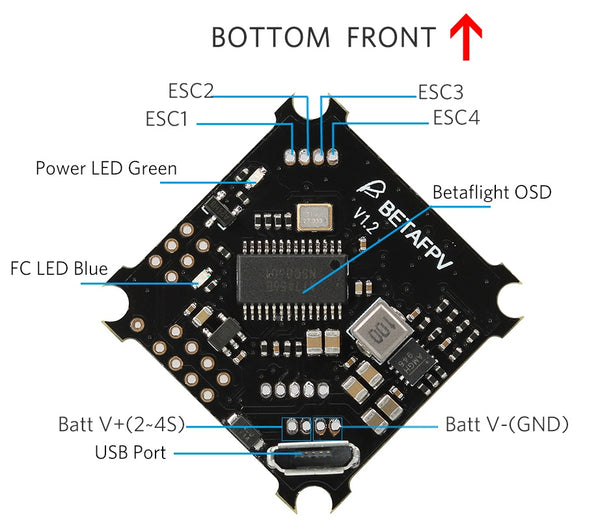 - OSD: Built-in BetaFlight OSD (STM32 controls OSD chip over SPI in DMA mode)