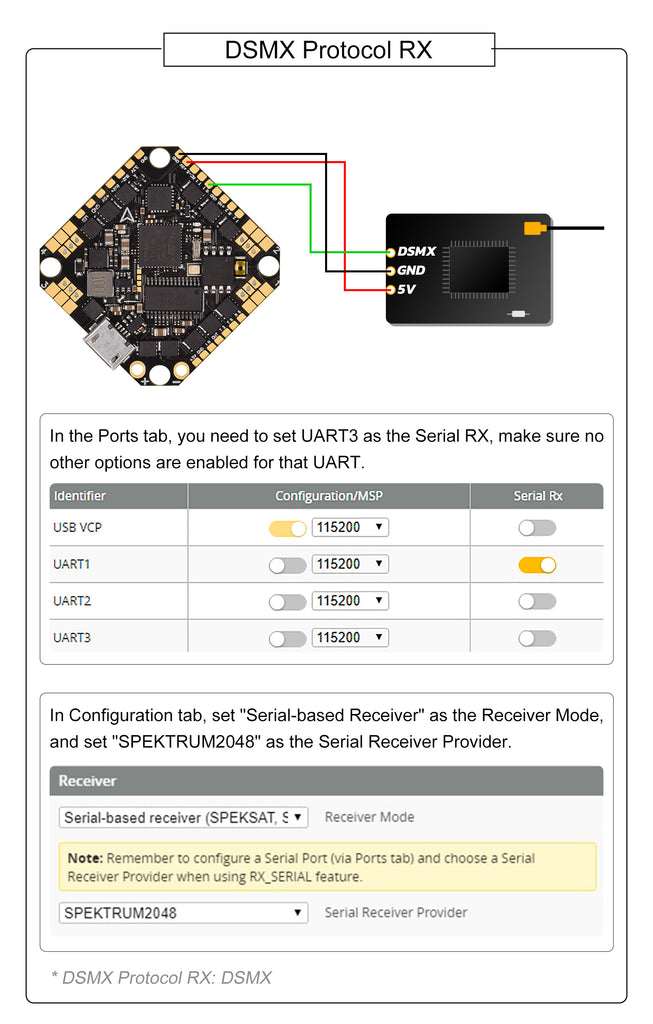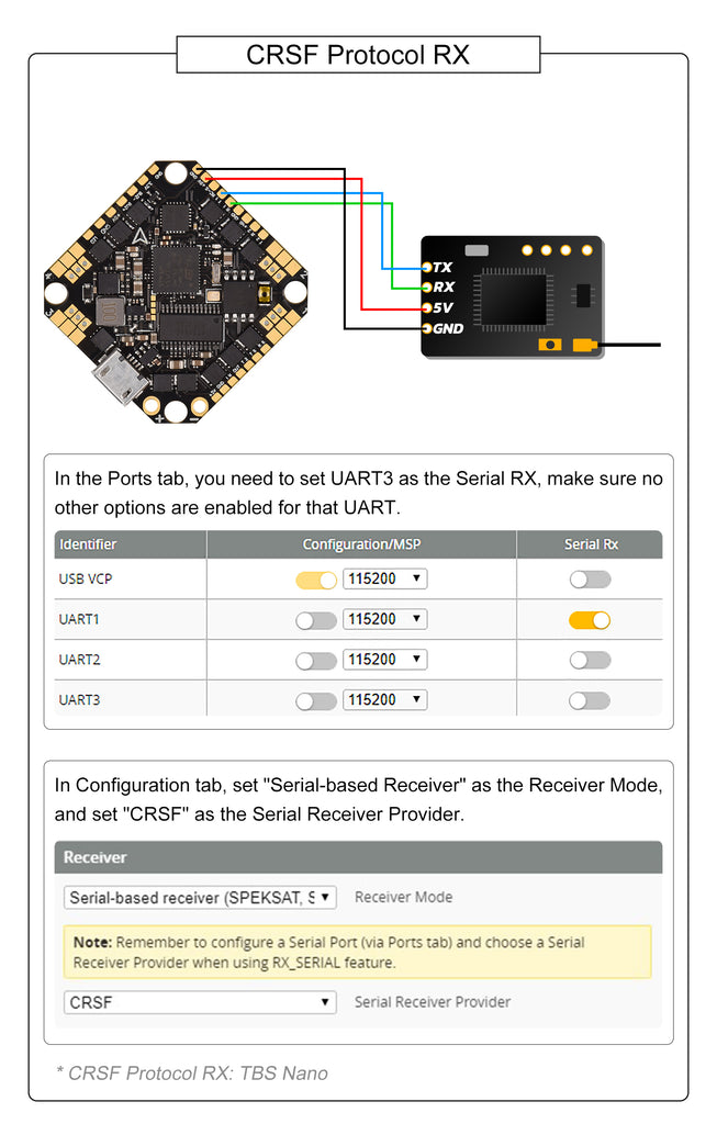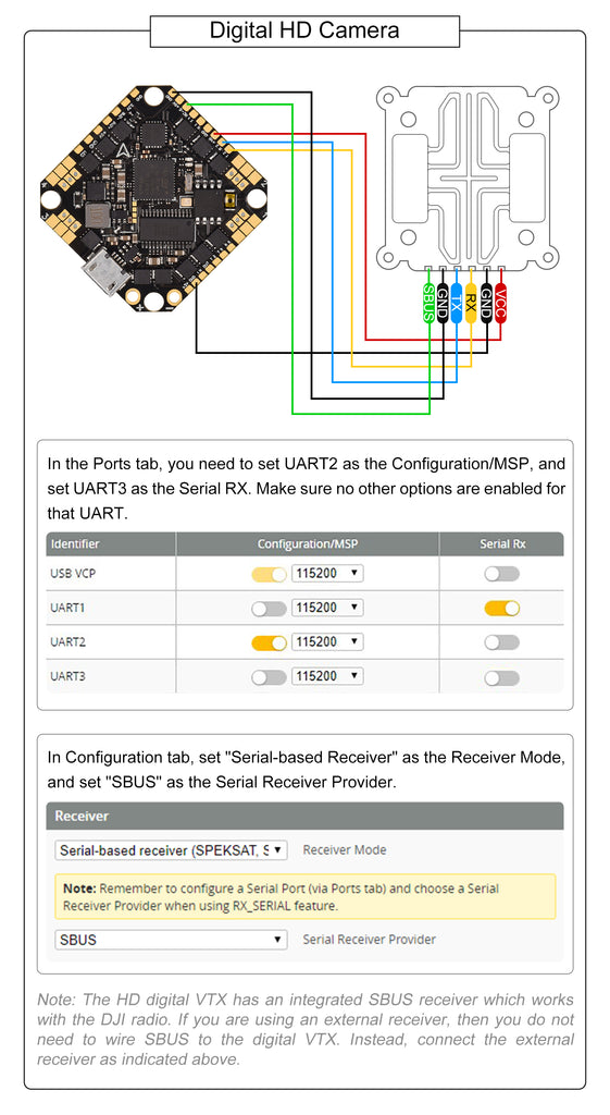 - 3 full UARTs (UART1, UART2 and UART6) are available in the V3 version. Pilots could use one UART for DJI digital FPV unit or Caddx Vista digital FPV unit and the other UART for external receivers like TBS Crossfire.