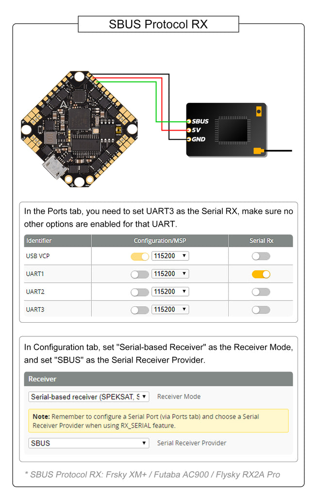 - Receiver: Support Frsky XM/XM+ Receiver/ Futaba Receiver/ Flysky Receiver/ TBS Crossfire Receiver/DSMX Receiver