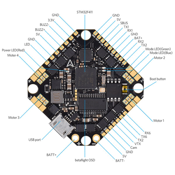 - Integrated with a Betaflight MATEKF411 processor FC, Betaflight OSD, F4 MCU, and 20A ESC, support 2-4S battery