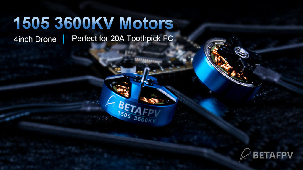 1505 3600kv motor hits the nice spot for high-powered 4s 4” toothpick builds with the ability to swing up to 4″ props with ease. Combined with 20A Toothpick F4 AIO FC, which will provide you enough output power.