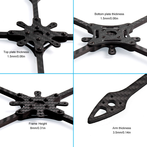 • X-Knight 5’’ V2 frame kit is made of T800 carbon fiber material with a 200mm wheelbase, the thickness of the solid removable arm is 3.5mm, guaranteeing the flight power of Quadcopter.
