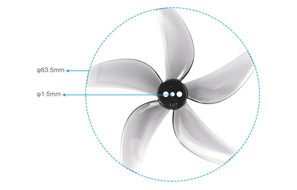 Gemfan D63 5-blade prop is a great choice for cinewhoop drone with pusher style, it offers more stability and thrust. More blades and less pitch result in a lower throttle lift capability and better precision and handling. We are using the match of D63 5-blade props and 1106 3800KV Brushless Motor on Beta95X V3 Whoop Quadcopter / Beta95X V3 HD Digital VTX, it offers the drone stronger power and less noise, allowing a super-efficient flight experience.