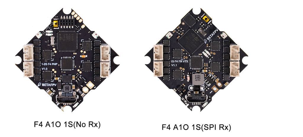 In this quad, the Frsky & Futaba Version is equipped with F4 1S AIO FC(SPI Rx), and the TBS & PNP Version is equipped with F4 1S AIO FC(No Rx) with an external Receiver.