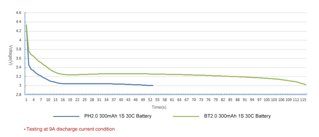 See the graph below of comparing the BT2.0 connector and PH2.0 connector (solid pin version) in BETAFPV 1S 300mAh battery. The discharge current is 9A in this test. The BT2.0 has double the time (about 2 minutes) and a 0.2v improvement in voltage sag.