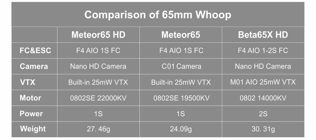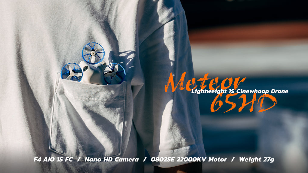 - Meteor65 HD is an ultralight 1S HD drone, weighs only 27.46g without the battery. It gives pilots a good balance of weight and a nice punch on the 1S battery. It is powerful and flexible, small enough to avoid obstacles and achieve FPV actions.