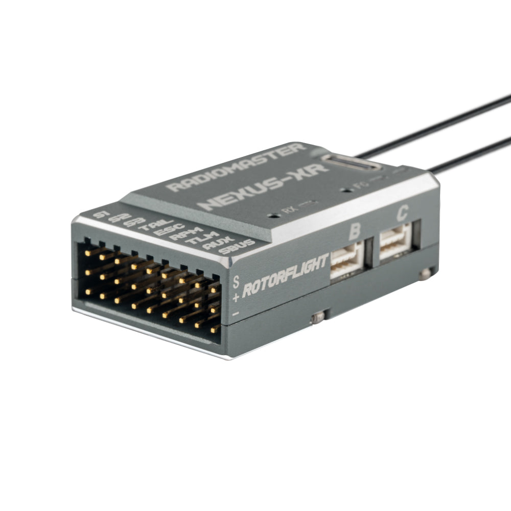 The Nexus-XR revolutionizes helicopter flight controllers by integrating a cutting-edge ExpressLRS receiver with dual Semtech SX1281 2.4GHz transceivers. This built-in receiver delivers exceptional RF performance, superior range, reliability, and effortless setup. It eliminates the need for external receivers, simplifying installation and reducing weight.