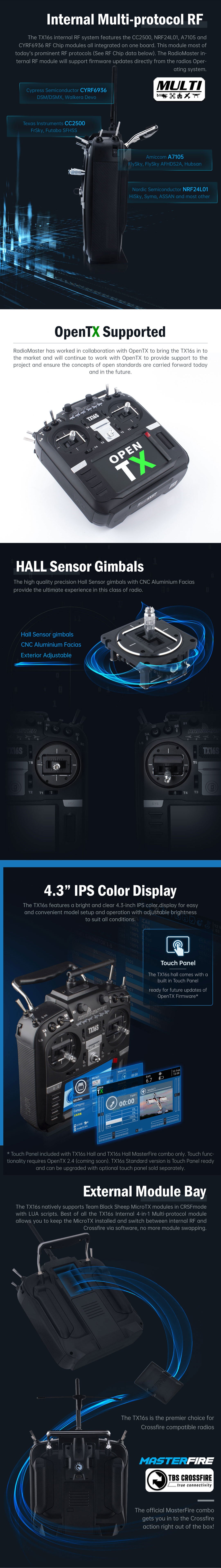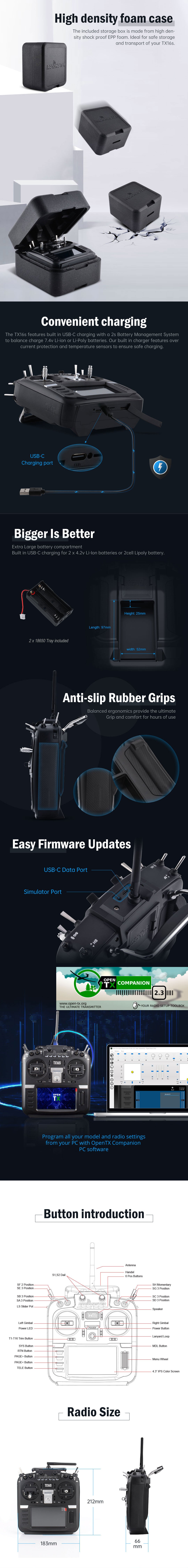RadioMaster set out to create the very best radio in its class without compromises. The TX16s has the best of everything we could fit into the radio today along with expandability and upgradeability for the future such as our Touch panel ready motherboard that will support future touch compatible version of OpenTX firmware and UART expansion slots. Our super smooth precision HALL gimbals with CNC facias offer refined looks and performance. Built-in USB-C charger, class-leading ergonomics, internal Multi-Module as standard, improved key layout and menu navigation, external SD port, improved sliders and more!