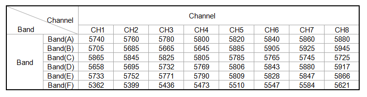 - Frequency: 40 channels (Brand A->E) and 8 raceband channels (Brand F)
